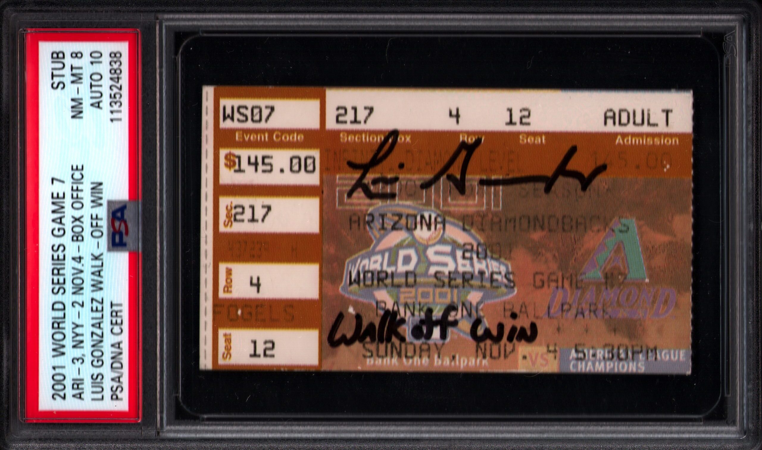 In the collection is a ticket to the World Series championship clinching game signed by Gonzalez. He adds the inscription, “Walk off win”.