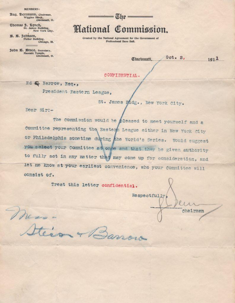 Notice the letterhead that alludes to this fact. Below the “National Commission” banner atop the letter are the words, “Created by the National Agreement for the Government of Professional Base Ball”. In this letter as president of the National Commission Herrmann writes to Barrow about the possible name change.