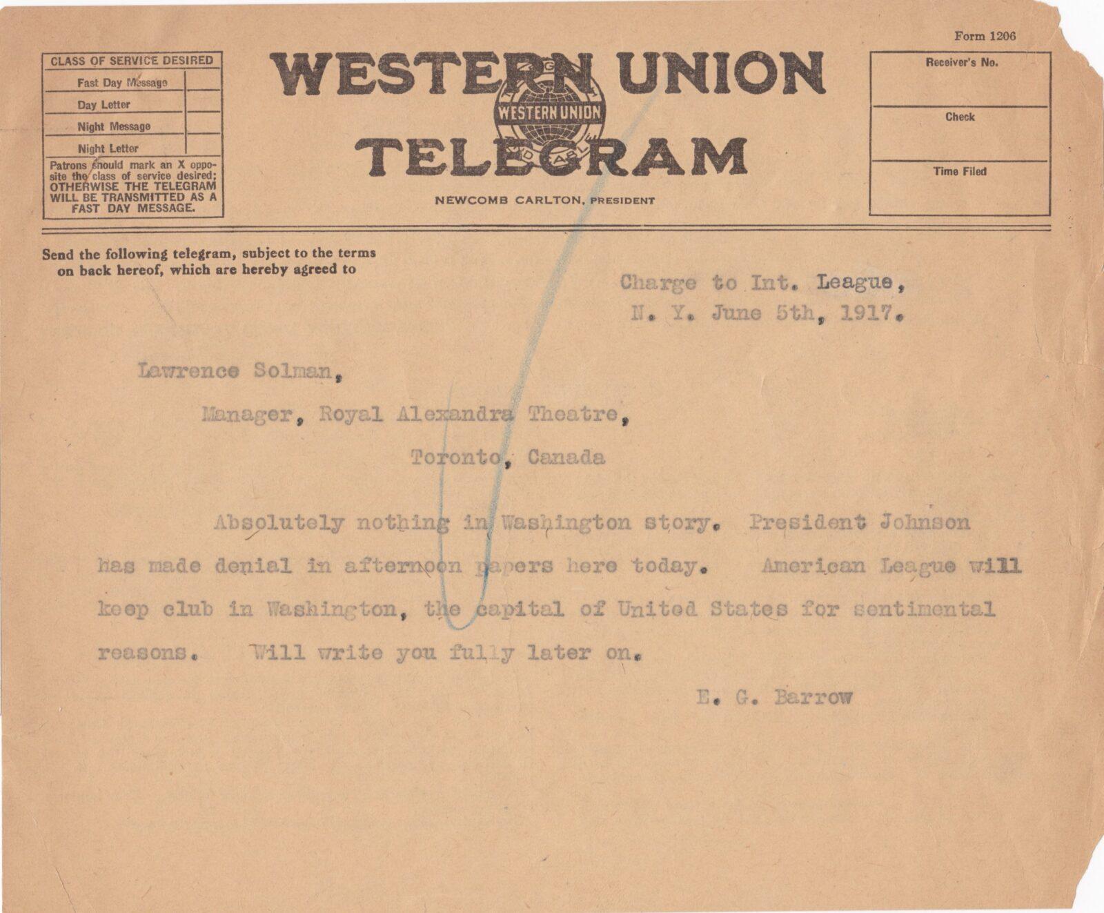 With the sustainability of a team in Washington in question, rumors started swirling that the team would move to another city. In the collection is this telegram dated June 5, 1917 sent by Ed Barrow to Toronto Maple Leafs owner Lawrence “Lol” Soloman.