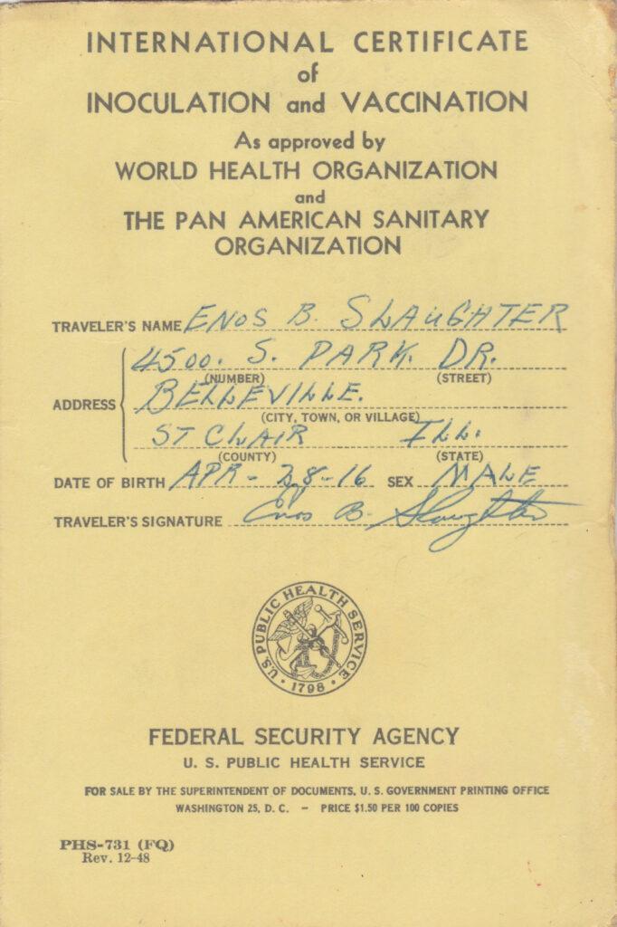 In the collection is the passport Slaughter used as part of a baseball exhibition team that traveled to Japan.
