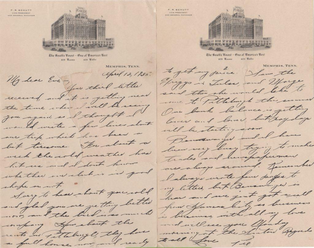 The date was April 13, 1935 when Pie Traynor posted this letter to his wife Eve. The Pirate third baseman addressed the envelope to “Mrs. Harold J. Traynor” thereby providing his autograph.