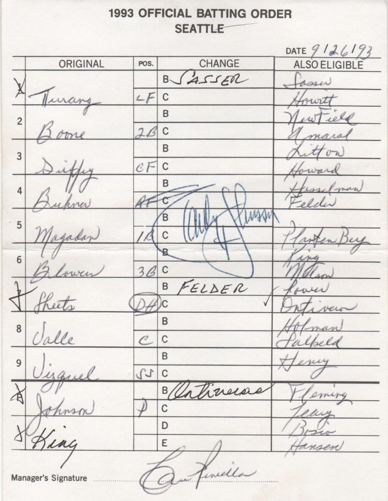 Signed by the Big Unit, the card also features the signature of manager Lou Piniella. Though the Mariners lost the game in 12 innings, Johnson did his part, allowing only two runs in ten innings of work. He struck out 13 and finished the game with 301 Ks.